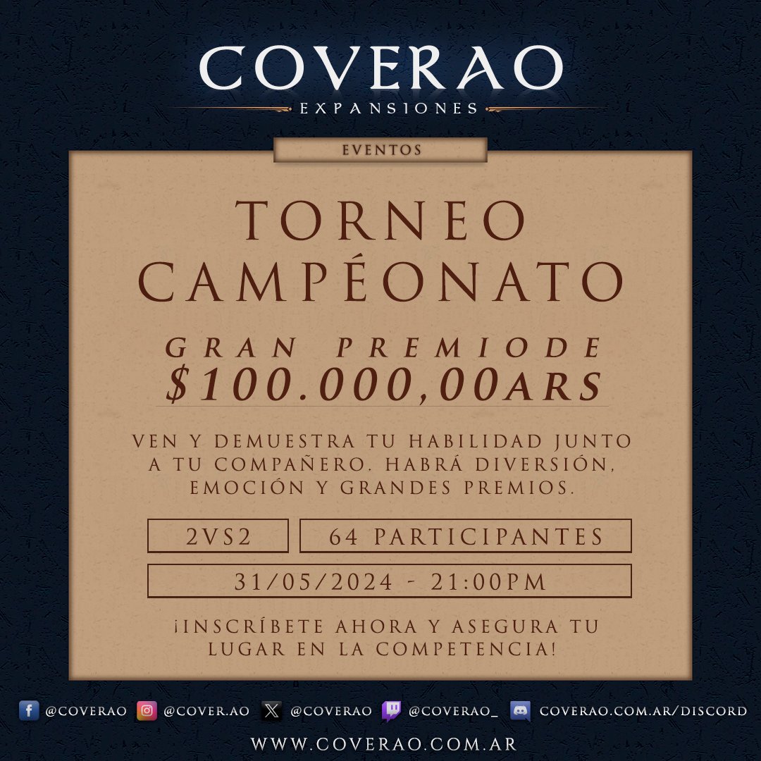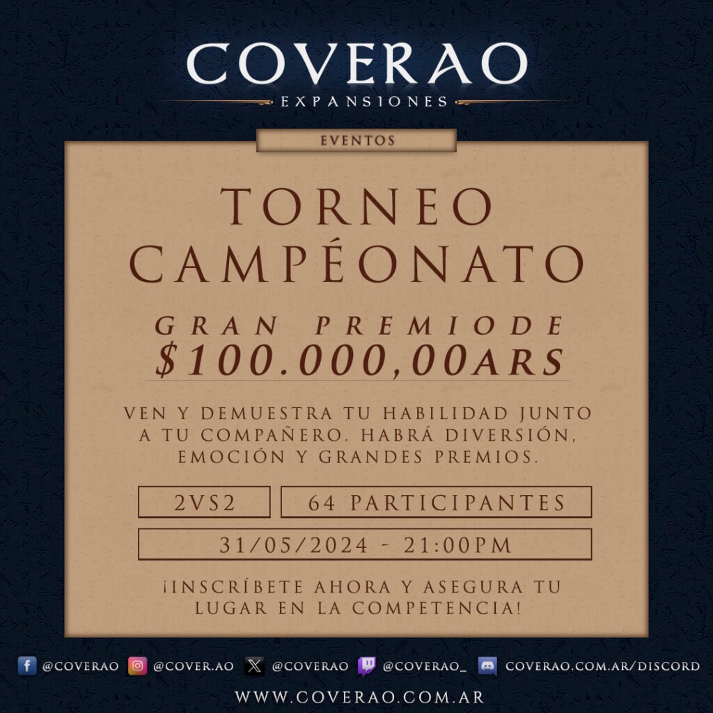 Nos complace anunciar el «Torneo Campeonato«, un gran evento masivo que se llevará a cabo este viernes 31/5/24 a las 21:00pm, recompensando a su ganador con $100.000,00 ARS.